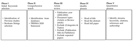 To address the research questions, an SLR was conducted within the Scopus and Web of Science databases, which are widely recognized as extensive repositories of peer-reviewed scholarly manuscripts [17]. The methodology for the SLR entailed five distinct phases: (i) selection of keywords; (ii) execution of a comprehensive search; (iii) review of articles; (iv) qualitative analysis; and (v) quantitative analysis. These phases are illustrated in Figure 1, detailing the SLR process. Additionally, the PRISMA 2020 Statement (Supplementary Materials) was employed in the SLR to guide the selection criteria for including or excluding articles. This approach ensured comprehensive reporting, increased confidence in the overall findings, and decreased duplication of articles, as depicted in Figure 2.