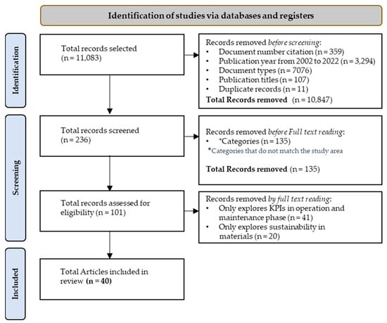 This search started without any limitations on publication dates, publishers, document types, or categories. The PRISMA 2020 Statement flow diagram and checklist was used to carefully choose and examine through relevant articles filtering pertinent content related to sustainability KPIs in construction, as depicted in Figure 2 [25]. Searches were executed using Boolean operators created in Phase I, in the following manner: TITLE-ABS-KEY (‘Sustainability Performance’ OR ‘Sustainability in Construction’ OR ‘Sustainable Construction’) AND TITLE-ABS-KEY (‘Sustainability Indicators’ OR ‘Sustainability Assessment’ OR ‘Sustainability Metrics’). This structured approach helped to identify an extensive collection of literature pertinent to the study’s aims. The criterion to determine the necessary article quantity was based on the frequency of occurrence in the search results; an article appearing multiple times signaled a point to either cease the search or modify the Boolean string. This approach yielded an initial list of 11,083 publications, which were then advanced to the third phase for an in-depth bibliometric analysis and review.