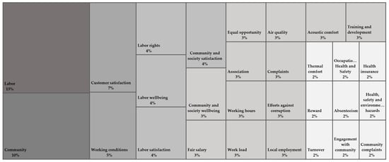 In the final step, the SLR focused on developing four concept maps to aid in the data analysis and interpretation, prioritizing sustainable aspects and sustainability KPIs based on the citation frequencies [28]. The first three maps were informed by insights gained from the earlier phases, while the fourth featured a code comparison to analyze the nexus between construction practices and sustainability principles. These concept maps synthesized findings from both quantitative and qualitative analyses, ensuring that the identified sustainability KPIs were deeply anchored in the empirical data and clearly reflected the core facets of the research question. This integrative approach facilitated the delineation of the three fundamental sustainability dimensions in building construction and the classification of pivotal KPIs prevalent in standard construction methodologies based on citation frequencies.