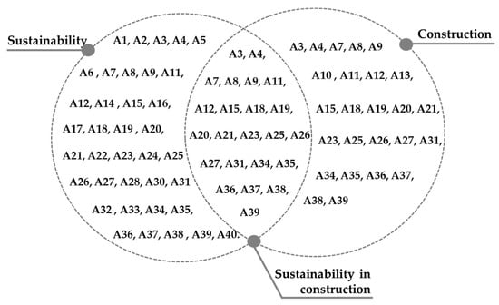 This stage highlights the integration of sustainability in construction, focusing on the balance among economic, social, and environmental dimensions [31]. Additionally, it examines KPIs for O-SCP [32,33]. Table 3 shows how different articles are connected based on research themes like construction methods and sustainable construction. The symbol ‘x’ represents that the specific research stream was found in the article. It includes the selected 40 articles to examine how sustainability and construction are linked, focusing on sustainability KPIs and O-SCP [34]. Table 4 details the specific sustainable aspects addressed in the 40 articles to define sustainability KPIs. Additionally, Table 4 categorizes these articles thematically, highlighting a predominant focus on the three dimensions of sustainability: environmental, social, and economic. These articles helped to evaluate the sustainability of construction projects by combining sustainability KPIs with sustainable aspects [35].