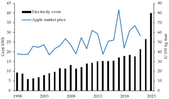 Long-term apple storage is therefore associated with substantial energy consumption but nonetheless crucial to providing a year-round supply of locally produced fruit. The required energy input, however, confronts fruit storage facilities with immense challenges. Sustainability efforts include a reduction in energy in the processes involved. Energy prices have risen rapidly over the past few years, while the market prices for apples have remained more or less constant and primarily responsive to the seasonal fruit supply (Figure 1) []. This presents an enormous financial constraint, especially as locally grown products face the competition of imported wares, often produced under cost-effective conditions [,]. Furthermore, if still reliant on conventional energy sources, long-term storage also contributes to a considerable carbon footprint [,,,]. These environmental and economic aspects highlight the critical need to improve the energy efficiency of the postharvest sector, ensuring long-term sustainable, environmentally friendly, and economically viable domestic fruit production.