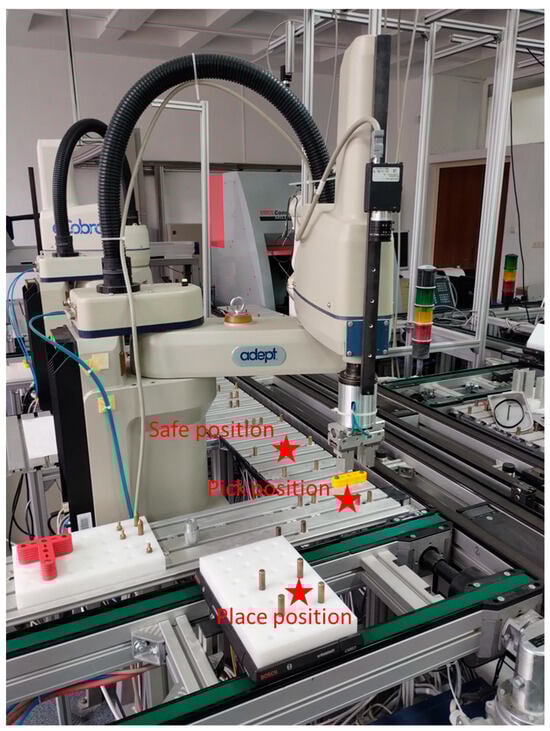 The resource on which the experiments were conducted is an Adept Cobra S600 SCARA robot with 4 joints (RRPR; R: rotation joint, P: prismatic joint). Repetitive movements (Figure 5) were executed for each joint at different speed limitations, resulting in the EC model presented in Table 2 (joint movements were executed with different speed limitations and the instantaneous power was recorded).