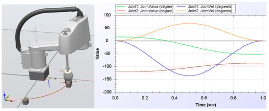 Digital representation of a robot arm executing a joint movement between two points and the kinematics of joint 1 and 2 (joint position and speed profile).