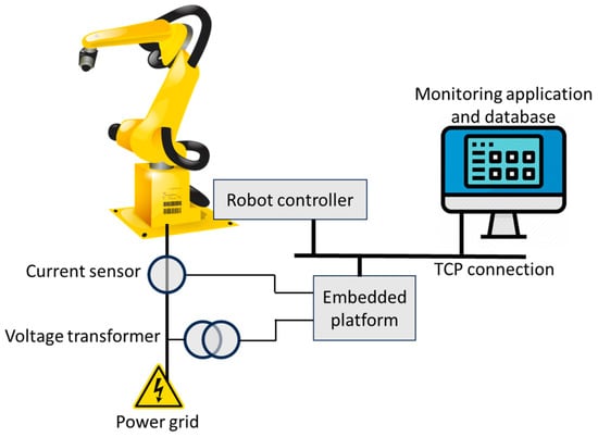 The smart meter consists of a current clamp and a voltage transformer connected to an Intelligent Embedded Device (IED) capable of: (a) processing high volumes of data in real-time for filtering inputs, integrating voltage and current signals, and adjusting the phase shifts introduced by the measuring transformers, (b) communicating over the TCP/IP network in order to form the digital EC model and synchronize with the monitored process (robot motion operations), and (c) parallel processing in order to separate the instantaneous power integration from the synchronization and communication processes. Figure 4 shows a schematic representation of the connected smart meter.