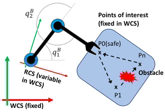 In all industrial applications the robot trajectory is a closed route which starts from a standard point defined as the ‘safe’ position (or loop-start point) and has a set of intermediate points resulting from the task specification (points of interest), the movement specification (intermediary points resulting from trajectory planning as is the case for linear movements in the WCS), and a set of fly-by points (needed to avoid obstacles). The number of intermediate points can vary from a small set of points for simple pick-and-place applications characterized by joint movements to a large set of points for complex trajectories characterized by both joint and linear/circular movements [,]. These points must be reached successively by the robot from P0 to Pn and back to P0; P0 is the ‘safe’ location where the robot waits for a cycle code.
