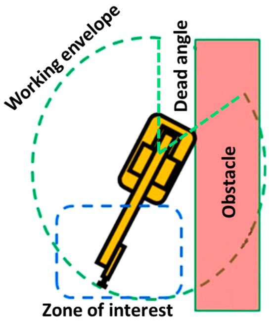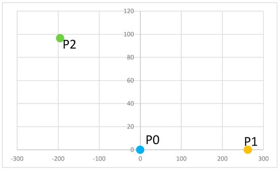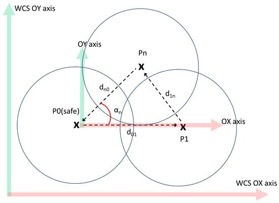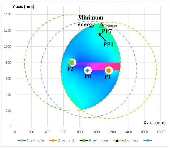 This process is described in Figure 11. The blue (safe—P0), orange (pick—P1), and green (place—P2) circles represent the possible positions of the robot base in order to reach the specific point. The search space is constructed with the data used in the steps presented in Section 4.