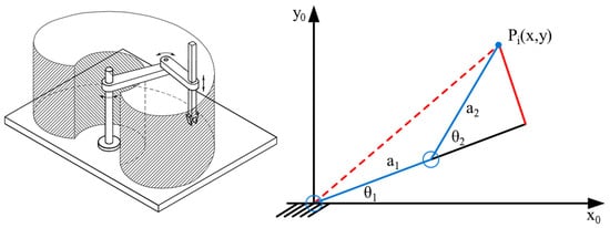 In the following section, the simplified optimization model for SCARA-type robots with 2-link horizontally articulated mechanism and simple revolute joints will be presented (see Figure 8).