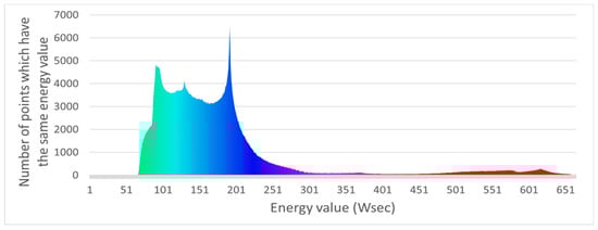 Search space of the robot placement optimization problem. The EC is illustrated with colours ranging from green representing low EC (less than 100 Wsec) to purple and red representing high EC (more than 300 Wsec). The energy histogram is depicted in Figure 12.