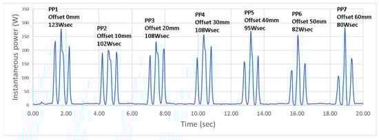 Energy consumption for the pick-and-place procedure with variable robot placement: the relative distance of the points of interest is shifted from the base with 10 mm for each cycle (1→2→3→4→5→6→7) (black arrow in Figure 11).