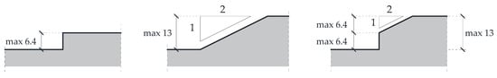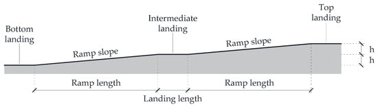 No intermediate landings are required for shallow sloped ramps (for example up to 3% [17] or up to 4.5% [5]). For steeper slopes, horizontal landings should be constructed at prescribed distances to reduce the overall slope, as presented in Table 7. For example, in the case of two ramps with a slope of 8.3%, connecting them by a 2 m long landing at a vertical distance of 0.7 m creates a reduction in the overall slope to 7.45%.