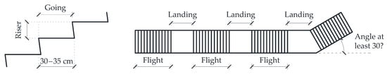 Risers and goings in a flight have to be uniform [5,20,32]; completely open risers are not allowed [5,17,20,32]. The prescribed dimensions of risers and goings are shown in Table 8.