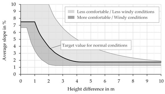 We recommend that slopes steeper than 8.3% are by no means used for new bridge structures. The reasons are as follows: a slope of 8.3% is the steepest slope that a person in a wheelchair can overcome without assistance [32], while slopes between 7.5% and 10% are considered the upper limit of ramp difficulty [21].