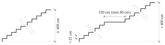 The greatest height difference that can be overcome with a flight of stairs is 4 m. For larger height differences, landings should be provided with the smallest dimensions of 80 by 80 cm and, if possible, 120 by 120 cm, as shown in Figure 5. No additional design parameters for stairs are given.