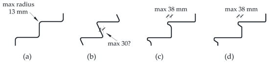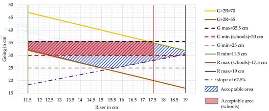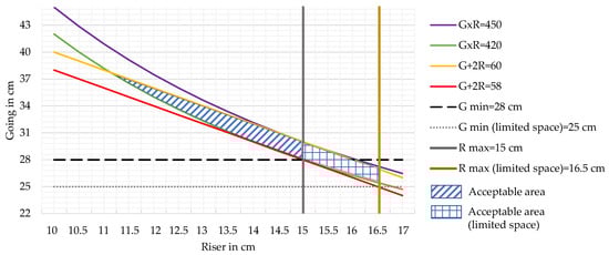 The acceptable measurements for going and riser values are presented in Figure 8 and Figure 9 for [17,32], respectively, in which relationships between the going and riser are given. Although in the SDM [32] the maximum going and minimum riser are not specified (Table 8), they can be determined from riser/going relationships (Figure 9).