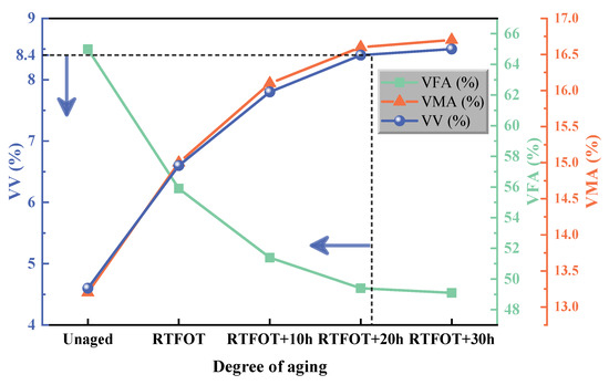 Different aging levels of bitumen are mixed with recycled aggregates, and then Marshall specimens are formed to measure indexes such as VV, VMA and VFA. The influence of bitumen aging on RAP performance is illustrated in Figure 5. The VV of RAP continually increases with the deepening of bitumen aging. The highest increase in porosity is observed when RAP is mixed with bitumen aged by RTFOT, reaching approximately 43%. Conversely, the lowest increase in porosity is observed when RAP is mixed with bitumen aged by RTFOT + PAV30h, at approximately 1%. This indicates that bitumen aging significantly impacts the VV of RAP. After bitumen undergoes RTFOT + 30h aging, the VV of RAP increases by about 85% compared to simulated RAP without aging. At the same time, as the degree of aging increases, VMA shows an upward trend and VFA shows a downward trend. When the aging degree reaches RTFOT + 20h, it remains stable. Bitumen aged by RTFOT + 30h is equivalent to the aged state of asphalt pavement after 7~12 years. Severe bitumen aging poses a significant hindrance to the compaction of RAP, thereby affecting the VV of RAP after formation [53].