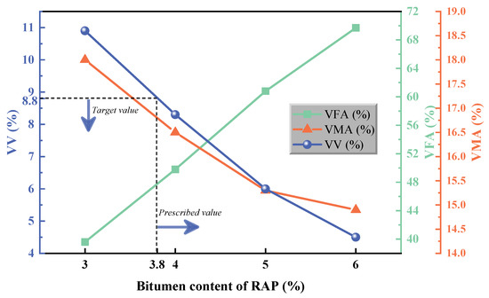 The impact of different binder contents on the compaction characteristics of RAP is illustrated in Figure 6. As the bitumen content increases, the VV of RAP shows a decreasing trend. With each 1% increase in binder content, the VV decreases by approximately 26%. A turning point occurs when the bitumen content reaches 5%, where the reduction in VV slows down with further increases in binder content. Ultimately, the VV of RAP is approximately 4.5% when the binder content is 6%. The main reason for this phenomenon is that at lower binder contents, there is insufficient asphalt to fill the voids between aggregates, resulting in a higher VV that is more challenging to compact. Moreover, as the bitumen content increases, VMA also shows a downward trend, but VFA shows an upward trend. This indicates that the added asphalt fills more voids between the aggregates, which helps to improve the compactness and performance of the mixture. The experiments observed that when the binder content is less than 3%, particle detachment occurs during the demolding stage of the Marshall test, preventing the formation of compacted specimens, and the VV cannot be accurately measured. This indirectly indicates the difficulty in compaction. With increased bitumen content, the voids between aggregates are filled with bitumen, decreasing VV and making compaction easier. However, since the asphalt in the mixture is aged, the magnitude of the change in VV diminishes.