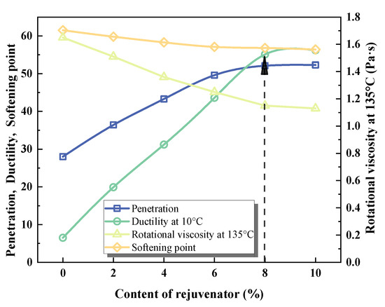 The reclaimed bitumen extracted by RAP was tested. The main performance indexes are shown in Table 1. The reclaimed bitumen hardened and could not meet the index requirement. It was necessary to add fresh bitumen and a rejuvenator for the reclaimed bitumen.