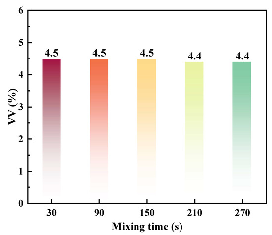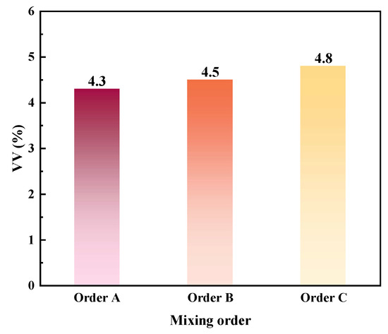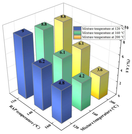 Temperature is a crucial factor influencing the quality of HIRAP [48,49,50]. Figure 4b shows the rate of change in VV of RAP. There is no apparent fitting relationship between compaction temperature and VV, but it is easy to see that the compaction temperature of 140 °C is the more critical parameter. VV is highest between 100 °C and 140 °C, with the minimum slope observed. As the compaction temperature exceeds 140 °C, the reduction in VV slows down, particularly in the temperature range of 160 °C to 180 °C, where the VV decreases only from 8.1% to 8.0%, a marginal 0.1% decrease. Overall, the VV of RAP exhibits a decreasing trend with increasing temperature. Analysis indicates that at a compaction temperature of 100 °C, higher asphalt viscosity hinders the compaction and re-arrangement of the mixture particles, requiring the mixture to overcome greater internal friction. With increasing temperature, the reduced asphalt viscosity contributes positively to overcoming internal friction, aiding in the re-arrangement of the mixture particles. Despite the lubricating effect of bitumen on aggregates with rising temperature, the aging of binder in RAP diminishes its lubricating effectiveness. When the compaction temperature is excessively high, the void size remains above 8%, exhibiting a converging trend, indicating a limit to the impact of temperature on VV. Simply elevating the compaction temperature does not significantly improve the compaction effect on the mixture, especially when the compaction temperature exceeds 160 °C. Moreover, excessively high temperatures exacerbate the secondary aging of binder in RAP, increasing the bitumen’s stiffness modulus and making it more resistant to compaction. In conclusion, it is recommended to set the compaction temperature for RAP from 140 °C to 150 °C.