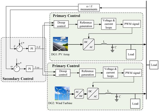 With the sustainable development of the world’s industry, the power system is also changing from fossil energy to clean energy, such as solar and wind [1]. As a result, hybrid microgrids have become an increasingly popular way of supplying electricity due to their reliability and operational efficiency [2]. Microgrids are the integration of distributed generations (DGs), energy storage devices, power electronic converters, and loads into a single system [3]. Microgrids are used in power grid applications for saving energy and reducing emissions, making environmental protection very favorable. The inputs of microgrids include photovoltaic, wind, and micro-diesel generators and other electrical energy, and the outputs comprise the voltage, frequency, and energy flows of microgrids. Its control requirements include system stability, response speed, and fault tolerance. Hierarchical control is the main method used for microgrids, and its control technology has become increasingly mature, with studies [4,5,6,7] adopting a hierarchical control structure for microgrids, primary control mainly using droop control to achieve stabilization of the microgrid output voltage and frequency, secondary control compensating for the drop caused by droop control, and the tertiary control carrying out the economic dispatch and energy management.