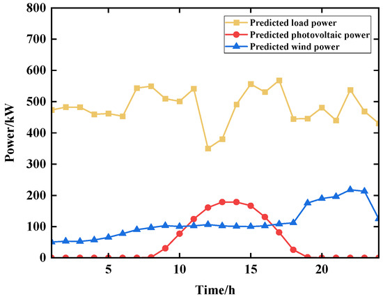In this study, the Pareto optimal solution theory is adopted to solve the multi-objective optimal scheduling problem of microgrids; the traditional particle swarm and improved particle swarm algorithms are used as the intelligent optimization algorithms; and the data of a power grid in East China are used as the simulation data. The wind power, PV, and load prediction curves in this region are shown in Figure 3. The configuration of the diesel engine unit generates power in the range of 100–400 kW, the maximum charging power of the energy storage battery pack is −200 kW, and the maximum discharging power is 250 kW. The predicted load demand is in the range of 300–600 kW. The whole microgrid can meet the predicted load.