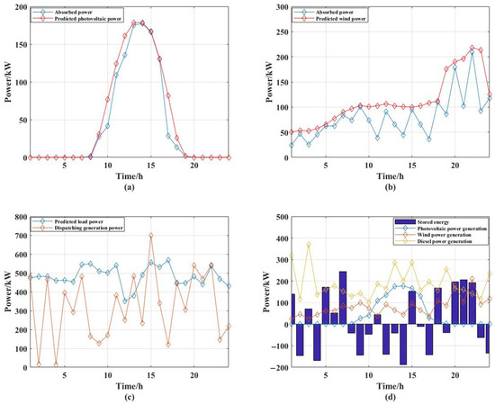 The value of energy utilization degree is low, indicating that the performance is better. It can also be seen from Figure 5a,b that the fit between the dispatched generation and the predicted generation is very high, which is significantly better than the traditional particle swarm scheduling results. It can be seen that the diesel power generation in the mid-day PV power generation out of the more significant decline, PV power generation is concentrated in the 9:00–17:00 of the mid-day moment, and wind power generation is concentrated in the 18:00–23:00 of the sunset and nighttime moments: the two form a staggered peak complementary effect. Figure 5c,d show the energy storage battery in the PV and wind power generation peak charging and reducing the power generation. With the diesel engine working, there is a better peak that enables the valley to be filled, stabilizing the microgrid power supply.