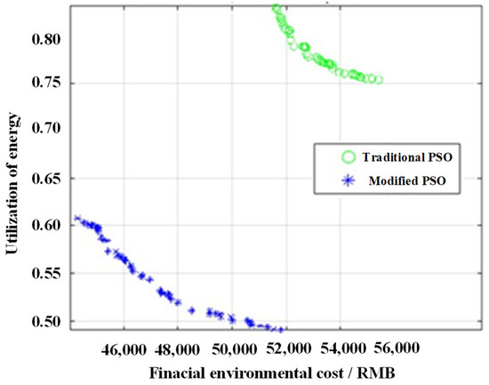 The respective Pareto frontier surfaces of the conventional particle swarm and the modified particle swarm algorithm can be shown by the particle positions in the external repository. As shown in Figure 6, it can be seen that the frontier surface of the modified particle swarm algorithm was advanced in comparison to the conventional particle swarm by the two objective terms stipulated in Equation (16). Moreover, the environmental economy and the degree of energy utilization were optimized, so the solution set of the modified particle swarm algorithm dominates over the solution set of the traditional particle swarm algorithm. This means that the modified particle swarm algorithm finds a more excellent scheduling scheme.