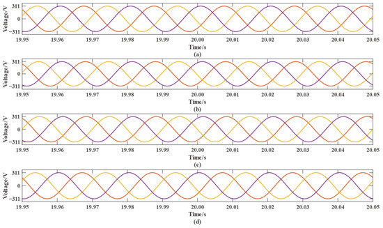 Figure 7 shows the voltages of each component of the microgrid within the period from 19.95 s to 20.05 s. Figure 7a–d represent the voltages of the PV, wind, diesel, and storage parts, respectively. The orange, purple, and yellow lines in Figure 7a–d represent the output three-phase voltage, respectively. It can be seen that the output voltages of each component in this time period are relatively standard three-phase sinusoidal waves, and the amplitudes are all stabilized at 311 V.