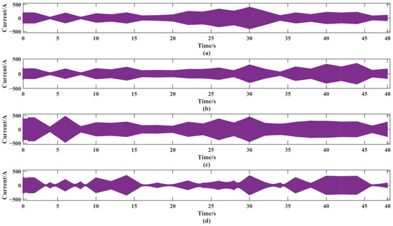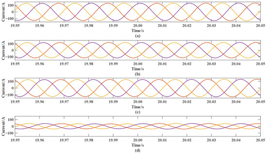 Figure 8a–d represent the currents of each component of the microgrid, and the currents of the microgrid changes continuously due to the power regulation. Figure 9 shows that although the currents of the microgrid change due to the power regulation of each component, the currents of each component are also three-phase sinusoidal waveforms in the time period from 19.95 s to 20.05 s. The orange, purple, and yellow lines in Figure 8a–d represent the output three-phase current, respectively.