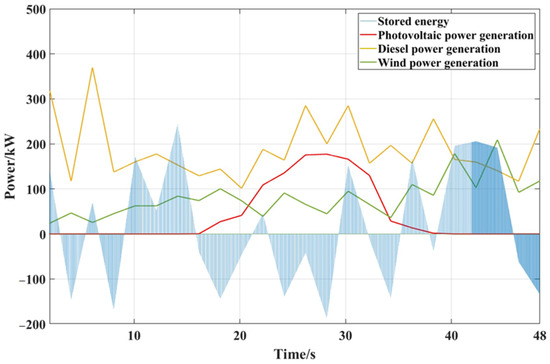 From Figure 4d, it can be seen that the diesel engines are more powerful throughout the whole process. Moreover, PV and wind power generation basically follow the law of unit power, but energy storage charging and discharging is more disordered, and it does not play a good role in shaving peaks and filling valleys.