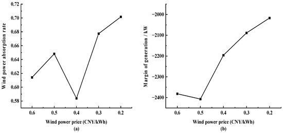 Results of adjusting wind power price: (a) wind power absorption rate and (b) generation margins.