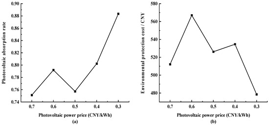 Results of adjusting PV power price: (a) PV absorption rate and (b) environmental protection cost.