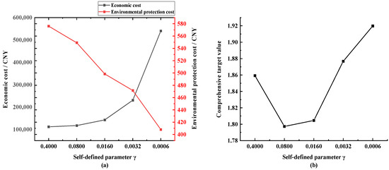 Results of changing the economic weight γ after capacity configuration changes: (a) economic and environmental protection cost and (b) comprehensive target value.
