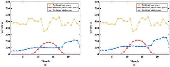 For the convenience of convergence and to quickly address particle swarm optimization, the economic and environmental indicators are combined in the objective function in Section 3.1.2 and balanced with the customized parameter γ, as detailed in Equation (15). The custom parameter γ variate affects the priority of economic and environmental costs in particle swarm optimization. In order to make a side-by-side comparison of the modified parameters’ effects, the generation capacity of the microgrid is altered to compare and analyze the relevant changes that should be made to the optimization strategy under different configurations of wind and PV power generation in the microgrid. The numerical size of the unit capacity adjustment is partially referred to in the literature [34].