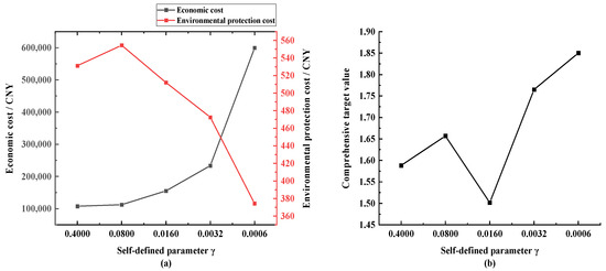 As shown in Figure 17, as the customized parameter γ decreases, the economic cost gradually rises, the environmental protection cost undergoes fluctuations with an overall decreasing trend, and the economic and environmental protection indexes still show a negative correlation. The final optimal value of the multi-objective index appears in the case of custom parameter γ = 0.016, which is lower than the optimal strategy under the original configuration γ = 0.08.