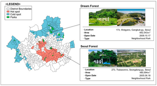 Spatial distribution of hotspots and cold spots and indication of Seoul Forest and Dream Forest (Source of Dream Forest photo: https://parks.seoul.go.kr/template/sub/dreamforest.do, accessed on 28 December 2023. Source of Seoul Forest photo: https://parks.seoul.go.kr/template/sub/seoulforest.do, accessed on 28 December 2023).