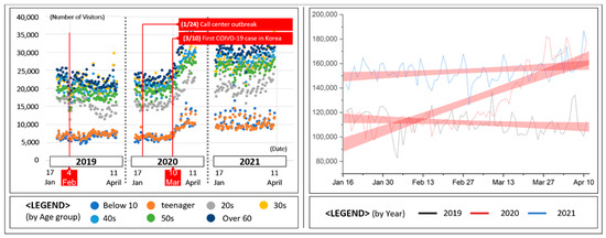 To achieve the purpose of this study, multiple steps were performed. First, a scatterplot was created to visualize the daily park visits for both parks. To accomplish this, rows matching the census tract assigned to each park were extracted from the original foot traffic data. The original age group data (i.e., 0 to 9 years old, 10 to 14 years old, …, 60 to 64 years old, 65 to 79 years old, 70 years of age or older) were converted into age groups by combining data based on the decade (the 20s, 30s, etc.). Then, the number of visitors to the Seoul Forest and Dream Forest were collected, and the raw data were plotted daily for visual description using an Excel 2012 spreadsheet (Microsoft Corp., Redmond, WA, USA).