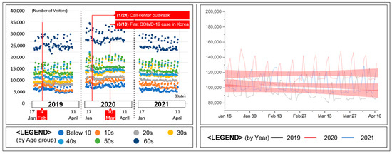 Lastly, to determine whether the effect of COVID-19 was exacerbated in vulnerable groups, RM-ANOVA was conducted again during 2019–2021 by filtering only the elderly (>60 years of age) population data. It should be noted that children under the age of 10 can also be classified as vulnerable groups, but since their parents often accompany them, they are not included in this data analysis. All main effects and interactions were examined, and the Greenhouse–Geisser corrected values were provided. Estimates of effect sizes were based on partial eta squared, and 95% confidence intervals were provided when appropriate. The threshold for statistical significance was set at p < 0.05. JAMOVI Statistics, version 2.3.18, was used for statistical analysis.