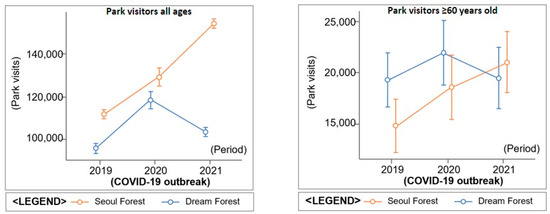 The second hypothesis of this study was tested using RM-ANOVA to determine if there was a statistically significant difference between the visitations of the two parks by vulnerable groups, specifically the elderly population. The sphericity assumption was met as evidenced by Mauchly’s test (Greenhouse–Geisser ε = 0.986, Huynh–Feldt ε = 0.998, p = 0.311); therefore, no adjustments were necessary. The RM-ANOVA results indicated no significant difference in the number of elderly visitors between the two parks (Between-Subject Effects; p = 0.303). However, a statistically significant interaction effect was observed between the time variable (COVID-19 effect) and park type (Period × Park type; F(1, 168) = 1.07, p < 0.001; Figure 5), revealing that COVID-19 had a significant impact on the difference between the two parks for the elderly population. Specifically, in 2019 and 2020, more elderly people visited Dream Forest than Seoul Forest, but after COVID-19, visitations to Seoul Forest increased, while those to Dream Forest decreased. In summary, there were no differences in elderly visitor numbers between the two parks, but significant differences were observed when the COVID-19 effect was considered.