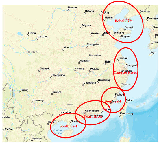 In this study, the empirical analysis is based on the example of port wind power generation projects in China’s coastal port clusters, as shown in Figure 3, which mainly include the Bohai rim port cluster, the Yangtze River Delta port cluster, the Pearl River Delta port cluster, the Southeast coastal port cluster, and the Southwest coastal port cluster. The Bohai rim port cluster mainly includes all the ports in Liaoning, Tianjin, Hebei, and Shandong provinces; the Yangtze River Delta port group mainly includes all the ports in Zhejiang, Shanghai, and Jiangsu provinces; the Pearl River Delta mainly includes all the ports in Guangdong province; the Southeast coastal port group includes all the ports in Fujian province; and the Southwest coastal port group mainly includes all the ports in Guangxi and Hainan provinces.