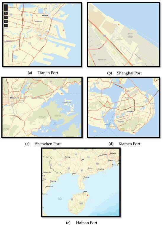 This paper selects Tianjin Port, Shanghai Port, Xiamen Port, Shenzhen Port, and Hainan Port wind power generation projects as examples for analysis. Based on the wind turbine location method proposed in this paper, the decision-making analysis of each project is applied, and the final locations of each project are shown in Figure 4, represented by the red pot in the figure.