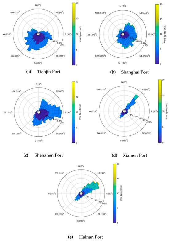 - The selected locations of wind turbines should have abundant wind energy resources, characterized a high wind speed and stable wind direction. Regions with higher wind speeds generally exhibit greater wind energy potential. In addition, a stable wind direction is conducive to the standardized layout of the wind turbine and reduce the frequent yawing faults and energy consumption, thus obtaining a more ideal wind power generation effect. Thus, in alignment with principle (1), the wind speed, wind direction, and other data can be further collected from the remaining available areas in the port area to rationalize the decision-making process of the wind turbine location.