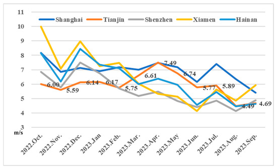Wind power generation project. (a–e) represent the wind power generation projects in Tianjin Port (latitude 39.02, longitude 117.81), Shanghai Port (latitude 31.35, longitude 121.62), Shenzhen Port (latitude 22.57, longitude 114.28), Xiamen Port (latitude 24.43, longitude 118.13), and Hainan Port (latitude 19.8, longitude 110.8), respectively.
