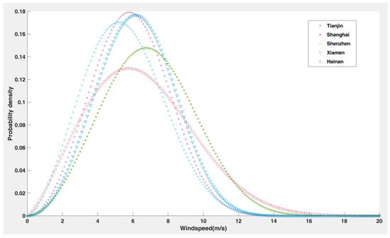 Therefore, the Weibull distribution is used for wind speed fitting and average wind power measurement in this paper. Additionally, the wind power density is calculated as in Equation (16) based on the Weibull distribution.