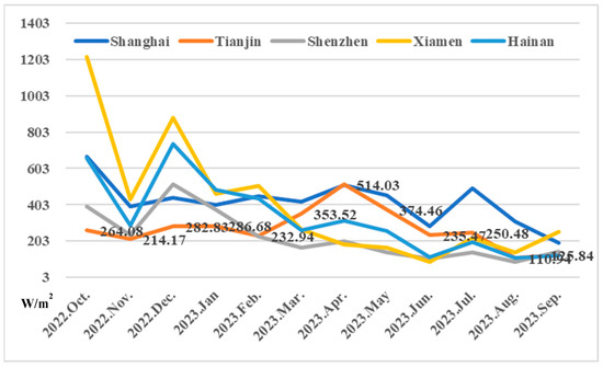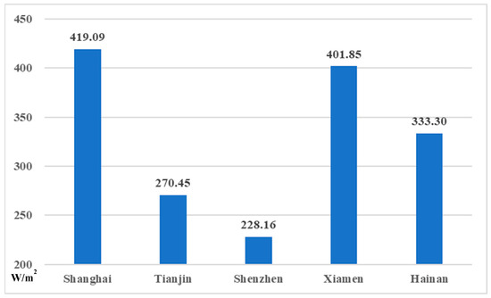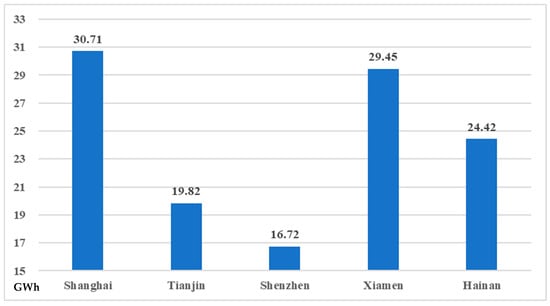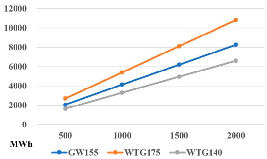 The evaluation of wind power generation is applied as follows: the diameter of the wind turbine is 155 m according to Table 4, and so the fan blade area is π*(155/2)^2 = 18,869 m2. The annual utilization hours of each wind turbines is 2395.8 h; meanwhile, the annual average wind power density of each wind power generation project is shown in Figure 10. As a result, the wind power generation (also known as total wind resource reserves) of each wind turbine in the project is calculated according to Equation (17) to Equation (19), which is demonstrated in Figure 11.