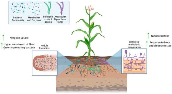 Inoculants are biological products composed of living microorganisms that benefit the development of different plant species, increasing the availability of nutrients for plants and improving the absorption of nutrients by plants. They also induce plant immunity and favor soil quality [33,34]. The microorganisms used in the preparation of inoculant formulations are known as plant growth promoters, examples of which include bacteria and fungi which can be found adhered to the roots (rhizospheric), inside plant tissues (endophytic), or in plant leaves. These microorganisms stand out for being nitrogen fixers (diazotrophs); phosphate solubilizers; and producers of siderophores, phytohormones, antimicrobial compounds, and enzymes. Examples of microorganisms used in inoculant formulations include bacteria of the genera Burkholderia, Pantoea, Enterobacter, Pseudomonas, Massilia, Sphingobium, Sphingomonas, Agrobacterium, Rhizobium, Bradyrhizobium, and Ochrobactrum and fungi of the genera Penicillium and Mycorrhiza [12,35,36]. A schematic representation of the interactions among those microorganisms occurring in the rhizosphere is exhibited in Figure 1.