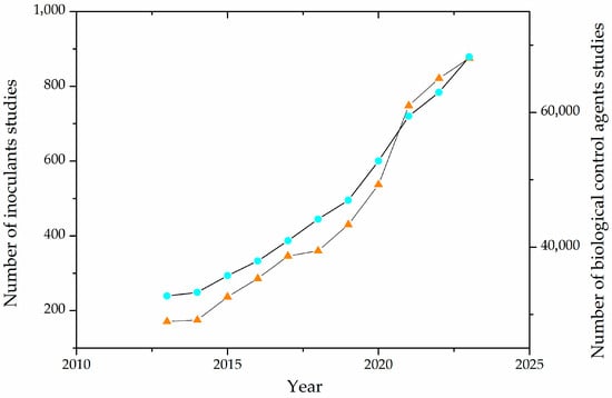 Evolution of the number of publications on agricultural inoculants and biological control agents in the last decade. The light blue circles (○) represent studies of biological control agents, and the orange triangles (Δ) represent studies of inoculants.