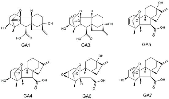 Gibberellins, or gibberellic acids (Gas), are a family of diterpenoid acid tetracyclics biosynthesized by plants, fungi, bacteria, and some algae genera that present hormonal effects in plant growth at low concentrations. These biomolecules exhibit structures with carboxylic acid, the presence or absence of unsaturated ring bonds, and different hydroxylation degrees; they have a molar mass of around 346.38 g/mol, are soluble in water (4.6 g/L in the room temperature), and have a melting point between 223 and 225 °C. Currently, 136 types of GA have been identified, and GA1, GA3, GA4, GA5, GA6, and GA7 are considered the most active. Their typical structures are represented in Figure 3 [116,117].