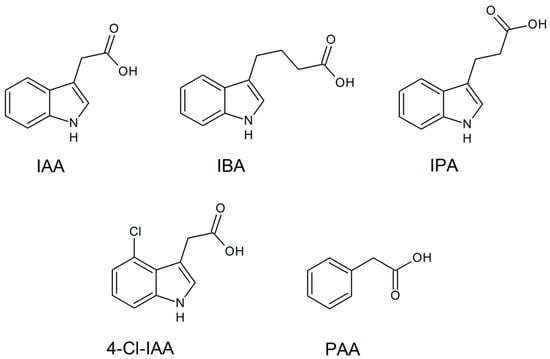 Auxins are compounds recognized as a family of aromatic molecules with a carboxylic acid group. They can be synthesized by plants and microorganisms and are responsible for controlling the plant growth response and development by means of cell differentiation, division, and expansion at low concentrations [160,161]. Commonly, these biomolecules are found in natural forms, as exemplified by indole-3-acetic acid (IAA), 4-Cl-IAA, phenylacetic acid (PAA), indole-3-butyric acid (IBA), and indole-3-propionic acid (IPA), and as exhibited in Figure 4 [161,162].