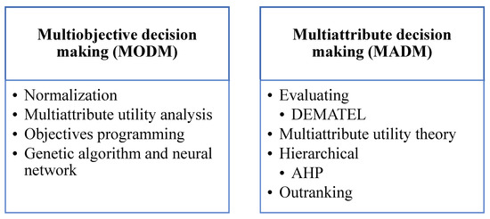 where the set op = {op1, op2,..., opn} gives rise to the opinions generated by the n participants—in this case, the experts or stakeholders consulted in making essential decisions for the problem, resulting in the collective preference opc [29]. Decision-making regarding organizational risks with a focus on sustainability involves complex interactions between the different stakeholders, requiring the participation of all stakeholders; therefore, using MCDM techniques positively supports decision-making [30]. This is completed in the presence of multiple criteria, especially those of tactical and strategic origin, as multiple conflicting objectives and attributes are involved, which provides support to decision-makers who are challenged by numerous and conflicting alternatives. Figure 1 shows the general approaches to MCDM [23,31].