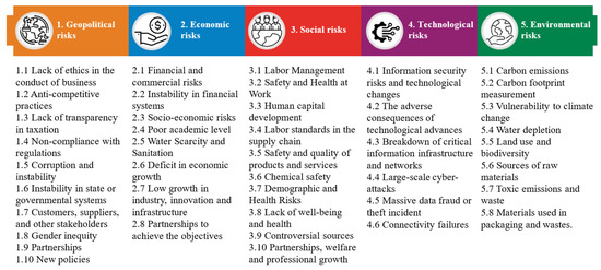 The reports by the WBCSD and COSO (2018) [7], the independent group of scientists appointed by the secretary general (2019), and the WEF (World Economic Forum) (2022) [25] (see Figure 2), were used as a basis for the characterization of organizational risks with a focus on sustainability. Likewise, objectivity was supported by international standards related to ESG assurance [4]. The five typologies of organizational risks focused on sustainability, with their respective associated sub-risks, are shown in Figure 2 and Figure 3.